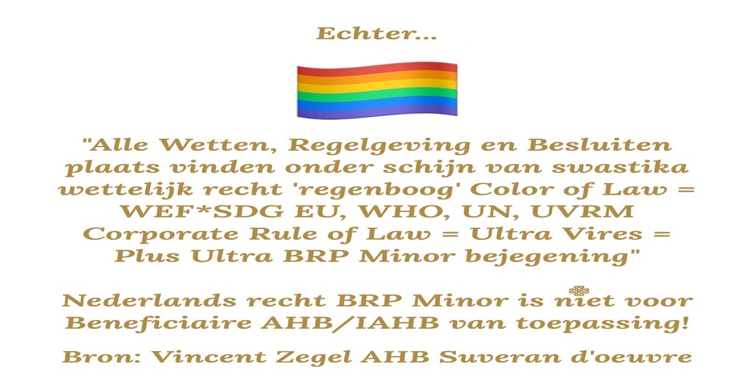 "Alle Wetten, Regelgeving en Besluiten plaats vinden onder schijn van swastika wettelijk recht 'regenboog' Color of Law = WEF*SDG EU, WHO, UN, UVRM Corporate Rule of Law = Ultra Vires = Plus Ultra BRP Minor bejegening"